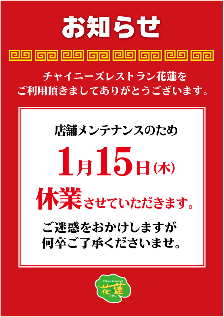 誠に勝手ながら、店舗メンテナンスのため、1月15日(木)は臨時休業いたします。